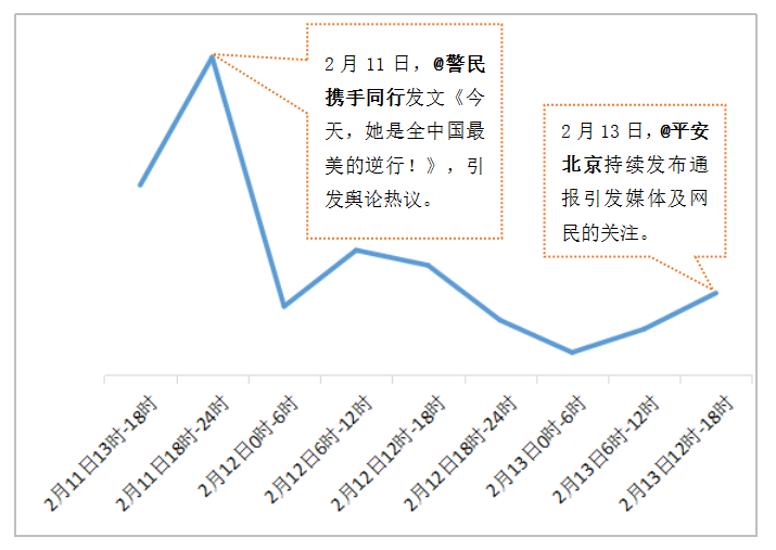 2月11日13时06分,@我的手机总没电率先在社交媒体平台曝光该事件,引发网民关注。@平安北京也在第一时间发布警方抓获犯罪嫌疑人,并将受伤人员送往医院救治的信息,并于当天16时通报了初步审查结果:犯罪嫌疑人行凶动因是发泄个人不满。与此同时,@警民携手同行、@头条新闻、@贺炜等发文称赞在案发时,一名女警官与安保人员不顾个人安危,逆行冲向持刀行凶者的英勇行为。当晚北京日报社旗下的微信公众号“长安街知事”发文,称:“2月11日21时晚20万人上街巡逻防控,正式启动社会面一级超常防控措施”,以上关键性信息引发媒体与网民的关注,相关舆情量在该时段达到顶峰,之后舆情热度有所回落。而随着案件进展,2月13日,@平安北京通报犯罪嫌疑人相关信息及其更具体的作案动因,并对协助开展工作的相关人员表达感谢,引发网民深入讨论,触发舆情走势小幅上升。