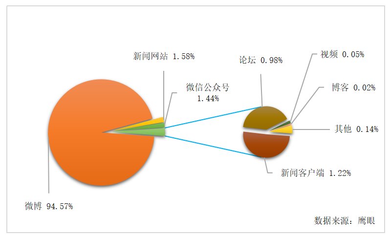 由上图可以看出,有关“北京西单大悦城伤人事件”的舆情信息94.57%来自微博平台,主要是政务微博、媒体官微及权威人士在微博平台对该事件进行传播,引起网民关注,增加了话题讨论量,如@平安北京、@环球时报、@头条新闻等媒体官微发布官方对此事的相关回应及后续审判情况,受到大量转发和评论,@贺炜、@托马斯仁菠切等大V及草根博主也参与此话题的讨论,引起网民高度关注和热议,使得舆情热度急剧上升。其次,有关“北京西单大悦城伤人事件”的舆情信息1.58%来自新闻网站,这些网站以其客观性、权威性对事件进行了及时的报道和后续跟踪报道,提高了该事件的舆情热度。此外,有关“北京西单大悦城伤人事件”舆情信息1.44%来自微信公众号,微信公众号凭借其庞大的用户基数、超高的用户粘性、多元化的传播对象及便捷的信息推送方式等特点助长了该事件的舆情热度。