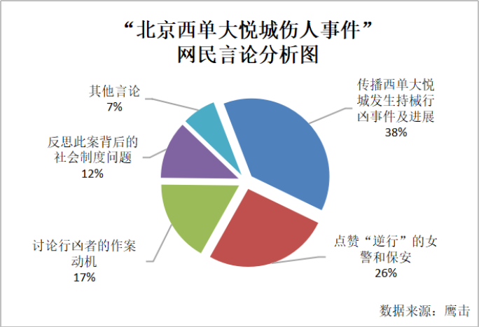 在“北京西单大悦城伤人事件”中,38%的网民都传播扩散这一消息,转发伤人事件的最新进展,同时也有效的阻止了谣言的扩散。在此事件中,“逆行”的女警和保安成为网民关注的焦点,26%的网民纷纷点赞他们勇敢的行为。有17%的网民讨论行凶者的作案动机,认为行凶者是为了宣泄个人不满而持刀伤人,也有网民认为凶者沉迷网络精神异常等。12%的网民反思此事件背后折射出的社会制度问题,比如探讨阶层固化对于草根的影响及收容遣送制度问题等。此外,7%的其他话题包括:个别网民恶意传播谣言被刑事拘留、科普防身措施等。
