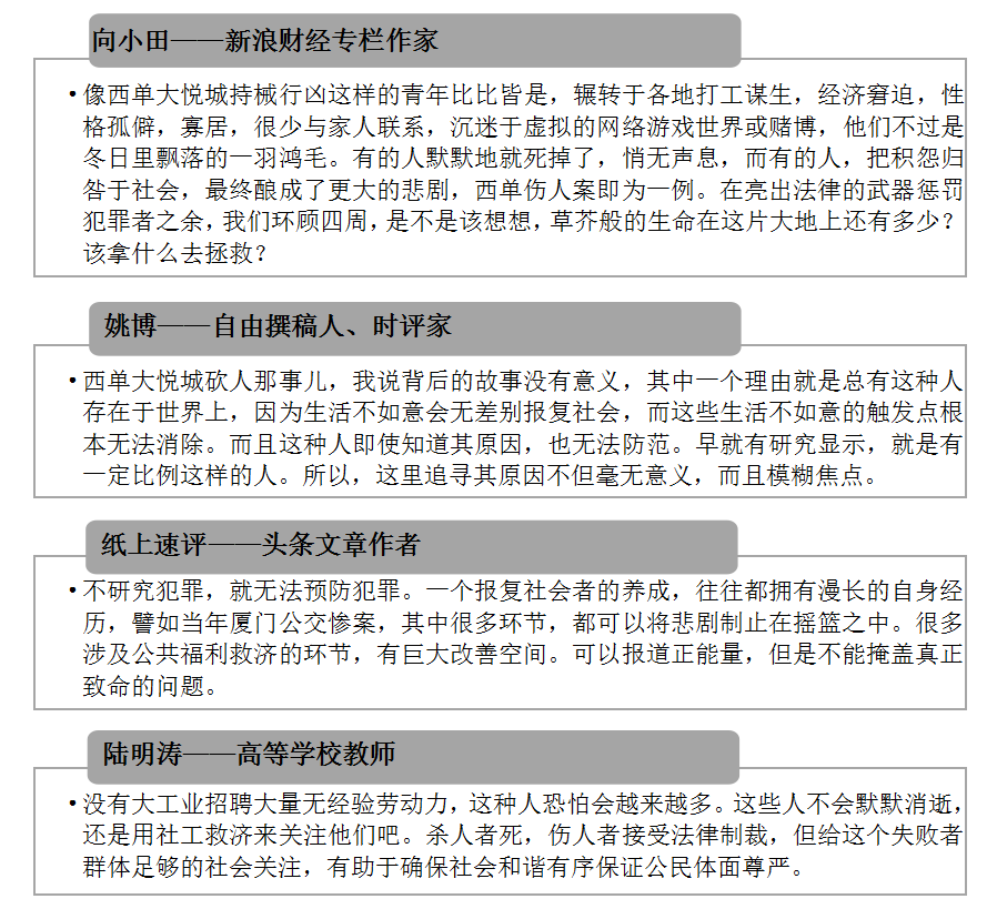 如今,该事件相关网络舆情已进入平复期,但由此暴露出的社会问题却不容忽视。近年来,以“报复社会”为名造成公共场所无辜人员伤亡的事件已多次发生,前有“浙江杭州公交纵火案”“江苏徐州幼儿园爆炸案”,今又有“北京西单大悦城砍人事件”,实在令人值得深思。当前我国社会正处于二元结构向多元结构转型的过程中,群体分化加剧,不断拉大的贫富差距极易造成社会戾气的产生与蔓延。而从此次涉事嫌犯“工作生活不顺”“逐渐产生悲观厌世”的供述中,也可以看出其作案动机实则长期积累,这也提示有关部门应积极疏导社会大众心理,进一步完善社会保障体系和利益诉求途径,化解社会戾气,避免有不良情绪者采取极端暴力手段伤害无辜群众、报复社会。