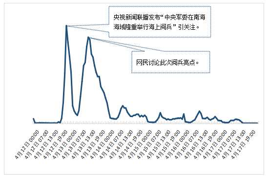 简介:2018年4月12日上午,中央军委在南海海域隆重举行海上阅兵,这是新中国历史上规模最大的海上阅兵。中共中央总书记、国家主席、中央军委主席习近平检阅部队并发表重要讲话。他强调,在新时代的征程上,在实现中华民族伟大复兴的奋斗中,建设强大的人民海军的任务从来没有像今天这样紧迫。坚定不移加快海军现代化进程,善于创新,勇于超越,努力把人民海军全面建成世界一流海军。相关舆情量在4月12日达到顶峰。