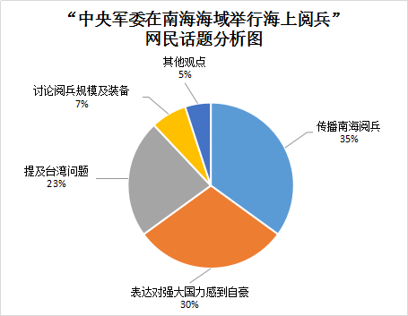 在此次海上阅兵事件中,有35%的网民观点传播南海阅兵的新闻;30%的网民观点表达出了对强大国力感到自豪,这部分网民感慨于祖国国力的强盛,感慨于数辈以来的努力,才让中国有现在如此高的国际地位;值得注意的是,23%的网民观点提及了台湾问题,这部分网民认为,中国选在此时此地阅兵,是向国际展示军事实力的信号,更是对台湾的警示,收复台湾指日可待。更有部分网民观点认为:此次南海阅兵与美国插手南海、“美台关系”急剧升温密不可分;7%的网民观点讨论阅兵规模及装备——这是新中国规模最大的海上阅兵,此外,有5%的网民观点进行了其他表达,如讨论部队官兵为保证阅兵顺利组织夜间训练、点赞网上热传的阅兵MV、关注军舰命名等。