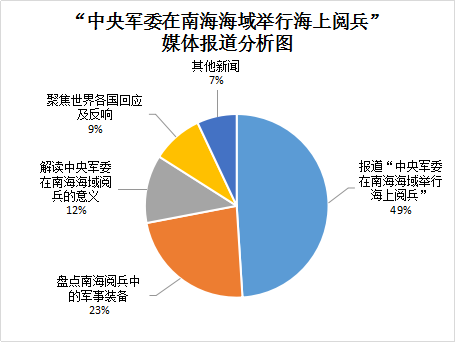 在“中央军委在南海海域举行海上阅兵”事件中,“央视网”“中国军网”等媒体对该事件的报道,引发大量网站的转载,使得传播该事件占据主导位置,其报道占比达49%。由于此次海上阅兵是新中国历史上规模最大的海上阅兵,新型潜艇、水面舰艇、作战飞机也集中精彩亮相,引发“央视网”“环球时报网”“新浪网”等多家网站对阅兵中的军事武器进行报道,此类报道占比达23%;伴随社会民众参政议政热情空前高涨,“人民网”“澎湃新闻”“中华军事网”等多家网站也乘势对此次南海阅兵的目的及意义发布深度解读文章,此类报道占比达12%;当下中国正面临国家安全环境的深刻变化,南海阅兵也受到世界各国关注,“参考消息”“海外网”等网站报道了境外媒体对该事件的回应及反响,此类信息占比达9%;此外,其他新闻占比7%,主要是祖孙同堂看阅兵、南海阅兵迅速圈粉等。