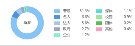 由上图可知,网民言论主要来自草根阶层(普通+达人)占86.9%,其余言论来自认证用户群(名人+政府+企业+媒体+校园+其他+团体),占比13.1%。认证用户的言论又以名人用户群最多,他们作为意见领袖发表了代表性的观点,在舆论场中具有较大的话语权。其次是政府用户群,利用微博平台发出权威、官方声音,正确引导舆论。