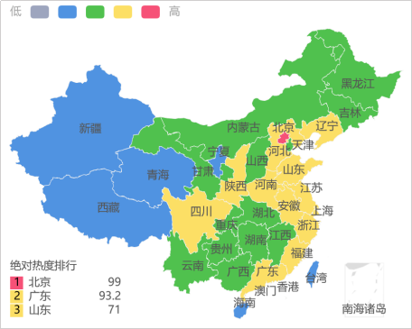 由上图可以看出,北京的网民对话题的关注度最高,其次是广东和山东。“中央军委在南海海域举行海上阅兵”属于政治军事类事件,地处政治中心的北京网民对此类事件的敏感度高,所以对此事件的关注度最高。广东和山东的人群关注热度次之,主要是因为广东距离南海较近,加上强大的人口基数导致话题地区热度上升,而山东黄海海域在1957年至今共举行过多次大型海上阅兵,故山东网民对此事也较为关注。此外两省的人口数量分别排名全国第一、二,人口数量众多也是原因之一。