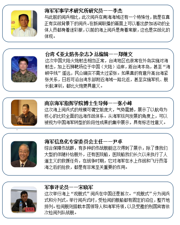 总结此次南海阅兵取得较高的讨论热度,其一是中央军委南海阅兵规模大,是历史上最大规模的一次海上阅兵,此次出动了四十八艘战舰,七十六架战机,军队第一艘航空母舰亦首次加入阅兵阵容。其二是参与的军事装备主要由国产构成,体现了我国军事装备的进展速度。其三是此次阅兵展示了海上军事实力,表现了海军实际训练水平与操作能力的大飞跃,标志着实战能力的重大突破,鼓舞了国民对海上军事行动的自信心和民族自尊心。