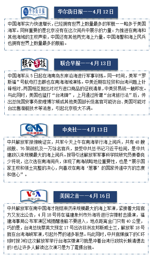 2018年4月12日,中央军委在南海海域举行海上阅兵,是中国历史上规模最大的海上阅兵。此次南海阅兵吸引了众多网友关注,舆论热度居高不下。网民自发对参与阅兵的装备进行分析、阅兵历史汇总贴层出不穷,反映了网民对海上阅兵的极大关注与热情重视;与往年阅兵相比,讨论内容质量更高,评论内容不乏专业性的军事评论,内容上大到我国海上军事发展史,小到数次阅兵的军事进展细节对比,无不表明网友的军备知识、军事素养得到较大提升。
