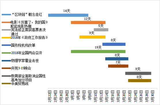 由上图可见,大部分事件的舆情持续时间都在一周左右,通常在7天或7天以内。另外,2018年全国两会召开、“区块链”概念走红、电影《厉害了,我的国》掀起观影热潮事件的持续时间超过了10天。