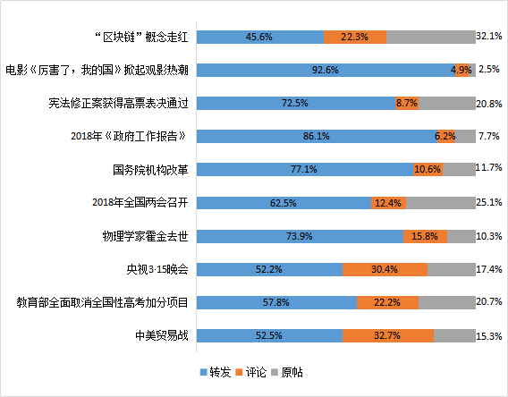 在本月选取的十个热点事件中,转发占比均大于原创,尤其2018年全国两会召开、2018年《政府工作报告》、国务院机构改革等涉及政府的重大事件中,博文转发的比例远高于评论和原帖,在这些事件中,大部分网民通过转发来帮助话题大规模传播,增强话题的影响效果,促使舆情热度快速升温。