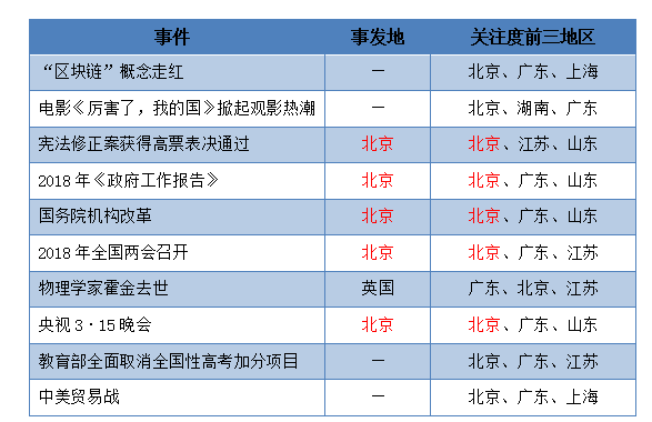 (图表中红色标注代表事发地与关注度前三地区相关)