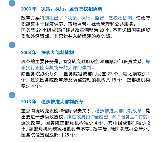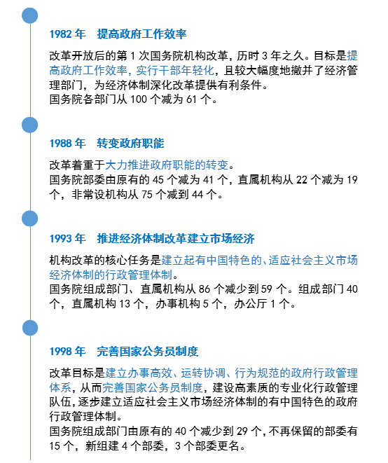 本轮改革之前,我国分别在1982年、1988年、1993年、1998年、2003年、2008年和2013年进行了七次规模较大的政府机构改革。