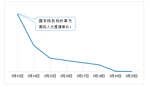 简介:2018年3月13日,国务院机构改革方案公布。根据改革方案,国务院正部级机构减少8个,副部级机构减少7个。除国务院办公厅外,国务院设置组成部门为26个。改革着重推进重点领域和关键环节的结构职能优化和调整,提高政府执行力。3月17日,十三届全国人大一次会议表决通过了关于国务院机构改革方案的决定,批准了这个方案。相关舆情量在3月13日到达顶峰。