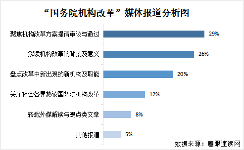 国务院机构改革方案公布后,29%的媒体聚焦机构改革方案提请审议与通过,“新华社”“人民网”等央级媒体及时发布报道,“新浪网”“凤凰网”等媒体则作转载报道。26%的媒体发文解读机构改革的背景及意义,《中国日报》撰文称改革的背景其中之一是党和国家机构属于上层建筑,必须适应经济基础的要求,“央广网”发文指出机构改革方案对进一步转变政府职能、建设人民满意的服务型政府,意义重大深远。
