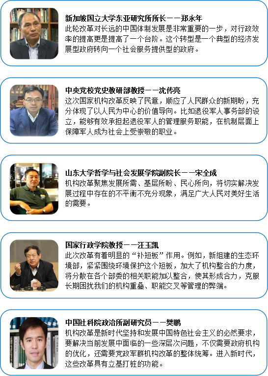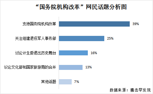 国务院机构改革方案公布后,有39%的网民表示支持,认为这是精简机构,提高效率的举措。另外有25%的网民关注组建退役军人事务部,这部分网民一方面认为军人保家卫国,理应让他们退役后获得更好的保障,另一方面则希望该部门成立后,能够办好事、办实事,切实解决军人的后顾之忧。