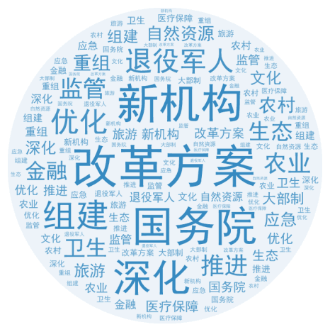 由上图可知,有关“国务院机构改革”的信息中,“改革方案”“国务院”“深化”等词提及频次较高,主要是国务院机构改革方案的公布引发网民热议,且媒体纷纷对最新的改革方案进行传播与解读。另外,这次机构改革新组建了多个部门,其中“退役军人事务部”“自然资源部”等也引发了媒体与网民的较大关注,使得“新机构”“组建”“退役军人”“自然资源”等成为了提及频次较高的词。