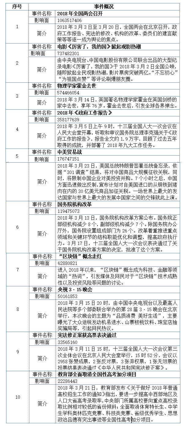 本月选取2018年全国两会召开、电影《厉害了,我的国》掀起观影热潮、物理学家霍金去世等共计十个热点事件从舆情话题、舆情热词、传播源头、时间跨度、关注人群等不同维度进行归纳整理形成报告。