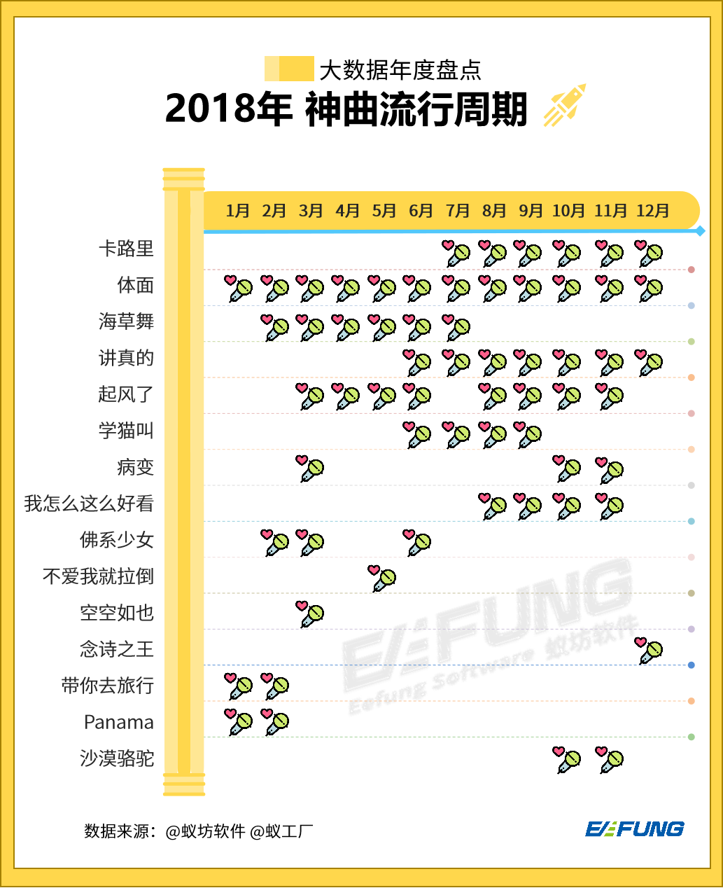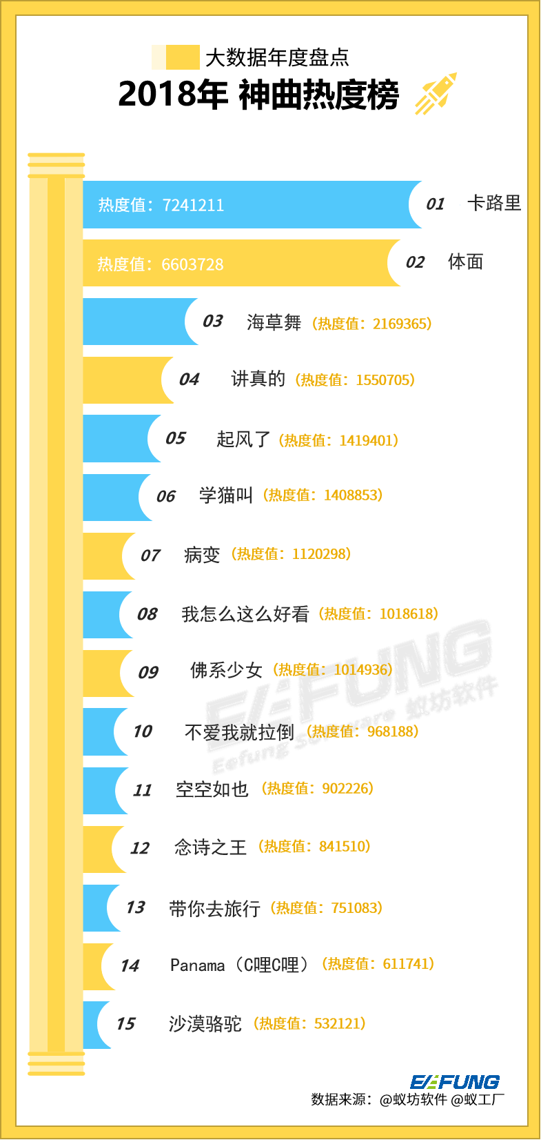 2006年龚琳娜的一曲《忐忑》使“神曲”文化兴起,也让公众的文娱生活变得更加丰富有趣。十几年来,一代又一代的“神曲”在流行过后消失在音乐大潮中,2018年又涌现了哪些“神曲”,哪一首最洗脑,我们用大数据解析一下。