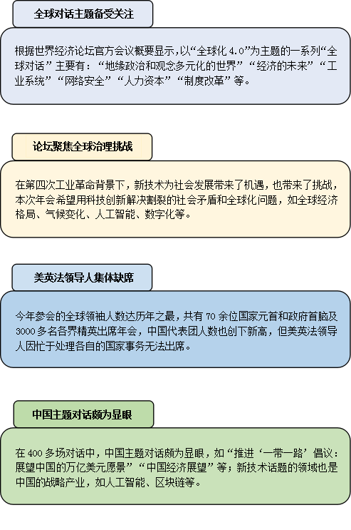 本次瑞士达沃斯论坛是在全球经济增长放缓、部分欧美国家陷入治理困境的大背景下举行的,如美国政府停摆、英国脱欧、“法国黄背心”运动等,虽然上述国家政府首脑缺席的原因不同,但共同点为国家治理面临困境,也颇有一丝政治制度失灵的意味。美英法各国治理面临的困境会造成保护主义、国家主义、单边主义的抬头,三者之间相互交织、相互作用,在一定程度上会影响世界各国合作意愿。同时,《2019年全球风险报告》指出,地缘政治紧张局势、经济前景趋于黯淡等因素将进一步挫伤国际合作前景。在此背景下,全球合作乃至全球化4.0,必须更具包容性、可持续性,且必须有更多道德原则作为根基。