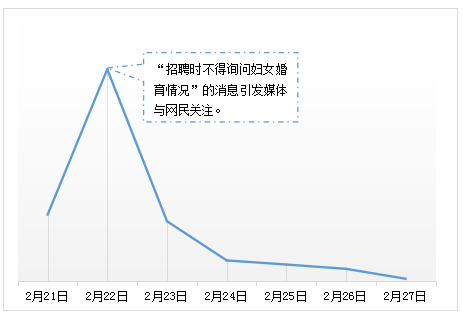 简介:2019年2月21日,人社部、教育部等九部门联合发布《关于进一步规范招聘行为促进妇女就业的通知》(以下简称《通知》),要求进一步规范招聘行为促进妇女就业。其中提出,招聘时不得询问妇女婚育情况;同时规定,对用人单位、人力资源服务机构发布含有性别歧视内容招聘信息的,依法责令改正;拒不改正的,处1万元以上5万元以下的罚款。通知发布后,引发舆论的广泛关注,相关舆情量于2月22日达到顶峰。