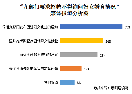其他8%的媒体报道涉及“点赞九部门反对求职性别歧视”“分析女性就业会不会更难”等内容。