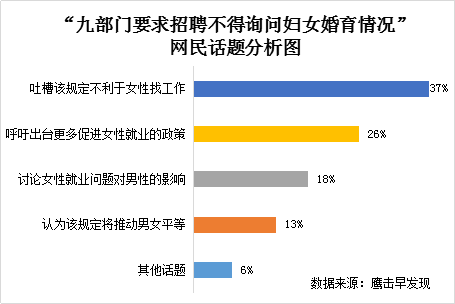 此外,还有6%的网民言论发表了其他观点,主要是讨论对刚入职就怀孕的女性所产生的影响、关注各个行业女性占比等内容。
