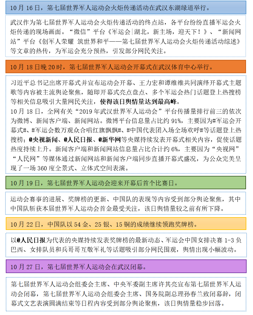 第七届世界军人运动会进入倒计时,“人民网”“新华网”“央视网”等众媒体对本届军运会进行预热,开幕式准备情况、备战军运会的运动员和工作人员状态、军运会场地设施运行状况、习近平总书记将出席第七届世界军人运动会开幕式并宣布运动会开幕等成为舆论关注点。舆论认为本届军运会出现多个“首次”,充分展示了我国的国际影响力和武汉的发展实力。#军运会开幕式彩排画面曝光#、#熨烫国旗需6个环节12道工序#、#军运会吉祥物兵兵表情包#、#军运会火炬抵达武汉#、#央视主播一串大赞大武汉#等话题吸引了大量流量,本届军运会开幕式将呈现哪些亮点,引发舆论大量探讨,中国方队入场人员、文艺表演节目、场内火炬传递和点火仪式等成为备受期待的内容。