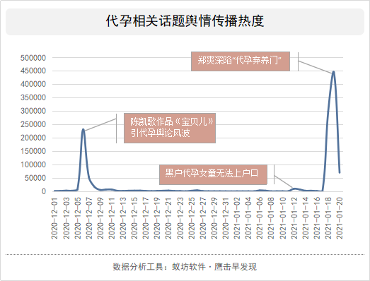 据蚁坊软件舆情监测系统显示,自2020年12月至今,网络中关于代孕的话题呈现出极高的舆情热度。这其中有热点代孕相关事件的刺激力量,也有日常关于代孕话题小范围的延续性讨论。总体来说,近段时间以来在代孕话题在高热度的舆情演化过程中,呈现出如下特点: