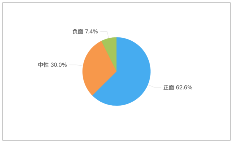 该时段内,有关“2026年全国两会”的舆情情感倾向中,正面舆情占比最多,达到62.6%;中性舆情次之,占比30.0%;负面舆情较少,占比7.4%。
