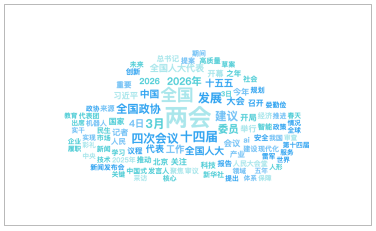 该时段内,有关“2026年全国两会”的话题提及频次较高的词语有“两会”、“全国”、“十四届”、“发展”、“3月”等。