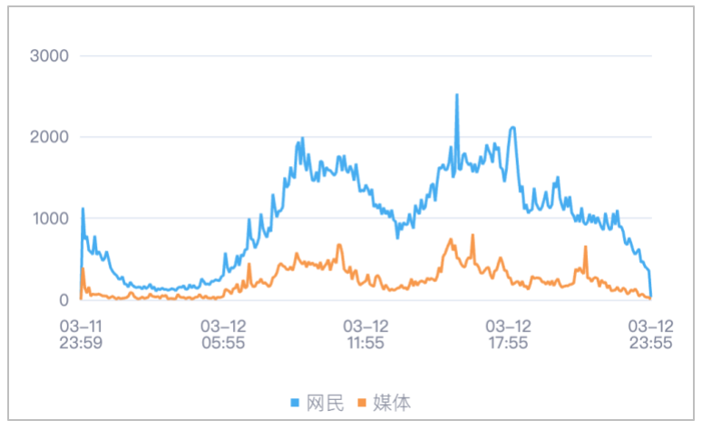 该时段内,有关“2026年全国两会”的舆情信息,通过观察趋势可知,媒体舆情于03月12日16时25分达到最高峰,网民舆情于03月12日15时45分达到最高峰。