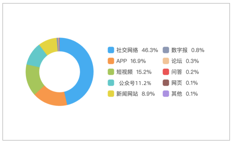 该时段内,有关“2026年全国两会”的舆情主要集中在社交网络平台,相关舆情量约占总量的46.3%,其次为新闻APP约占16.9%,短视频约占15.2%。