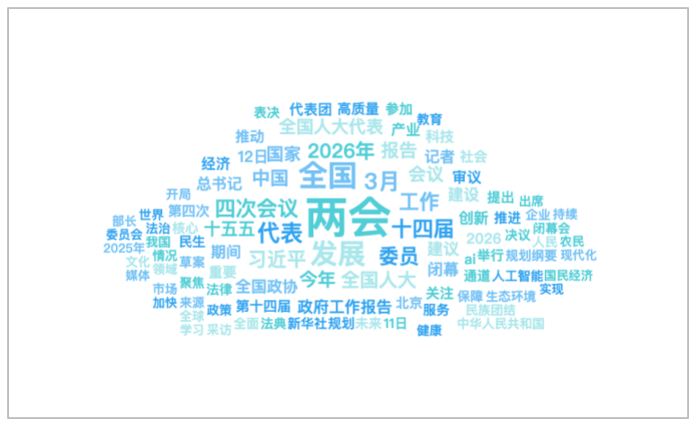 该时段内,有关“2026年全国两会”的话题提及频次较高的词语有“两会”、“全国”、“发展”、“代表”、“3月”等。