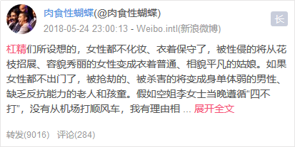 其中,网友@莲子清如水Yuzu的评论获赞最高,“有一点说的不完善,即使女性集体不出门,她们还是可能受到家人的性侵或暴力。也屡见不鲜。”这种与博主完全不在一个次元、同一层次上,靠着偷换概念、转移话题来博出位,是“杠精本精”无疑了。