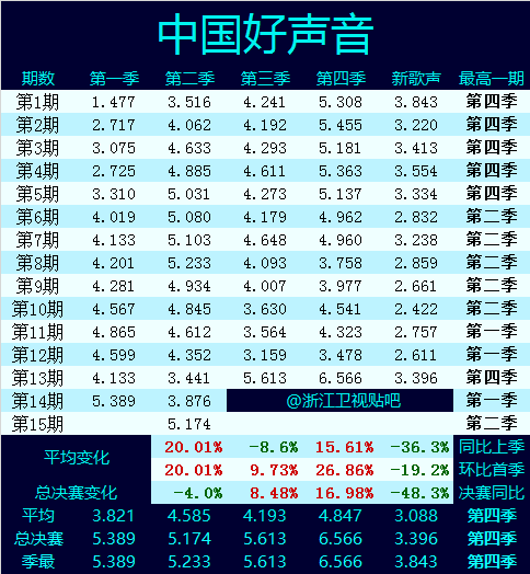 从浙江卫视贴吧处获得一张往年好声音的收视率数据表。对比来看,《中国好声音2018》收视率创新低(平均1.7)。第一季的收视率趋势最可观,直线上升,第二季、第三季较为平稳,第四季有高开低走的趋势但不明显,第五季(新歌声)更名后收视率衰退情况明显。