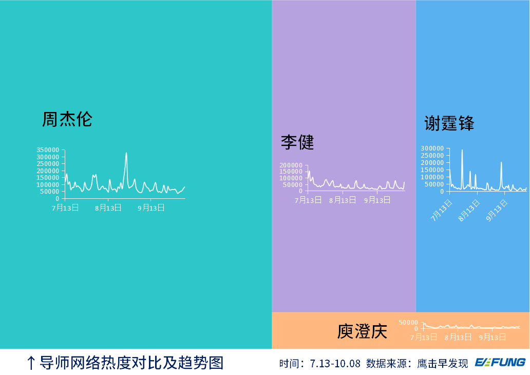 从热度树图看,周杰的热度有绝对领先优势,其次是李健、谢霆锋、庾澄庆。