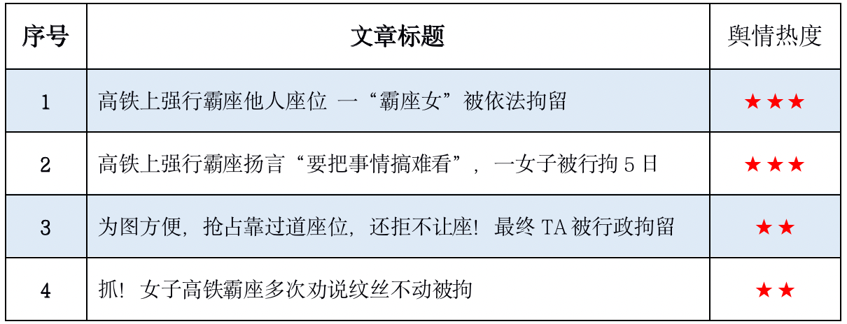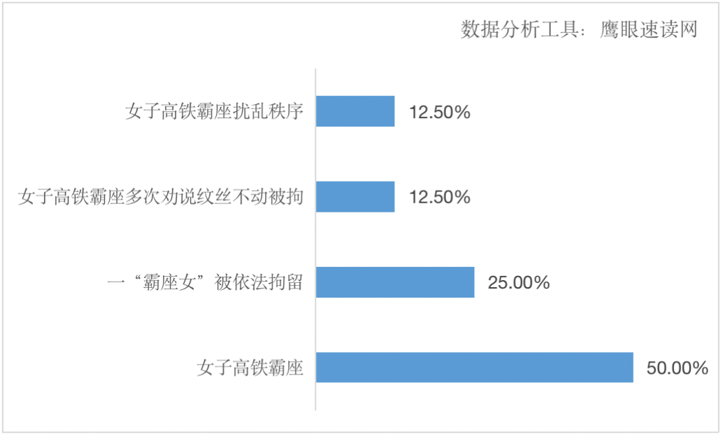通过抽样以及内容聚类分析可知,媒体报道的角度主要围绕“女子高铁霸座”展开,相关占比为50%。其次是有关“一“霸座女”被依法拘留”以及“女子高铁霸座多次劝说纹丝不动被拘”的话题,占比分别25%和12.5%。