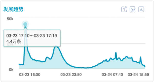 2022年3月23日16时-2022年3月24日16时,有关“东航客机失事”的信息总量约**万条(不包含评论)。结合全网监测系统观察舆情的整体走势来看,相关舆情量在3月23日17时10分至19分达到高峰。