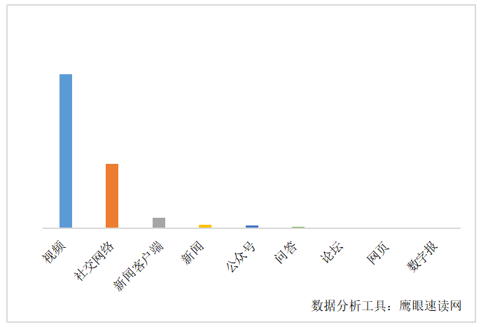 由上图可以看出,有关“杭州一金店使用鬼秤被罚”的舆情主要集中在“视频”平台,“视频”平台舆情占总量的65.4%,其次为“社交网络”平台占27.4%以及“新闻客户端”占4.5%。