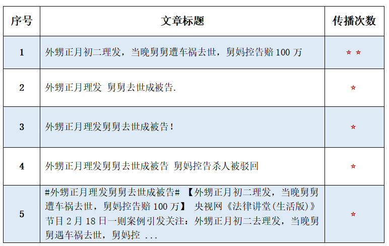 由上图可以看出,有关“外甥正月理发舅舅去世成被告”的舆情主要集中在“社交网络”平台,“社交网络”平台舆情量,占总量的97.1%,其次为“视频”平台占2.1%以及“新闻客户端”,占不足1%。