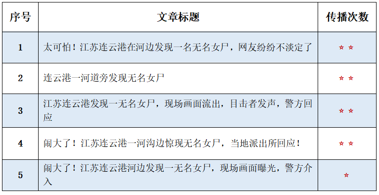 由上图趋势可以看出,全网有关“江苏连云港一河道现无名女尸”的舆情最高峰出现在08月26日23时。