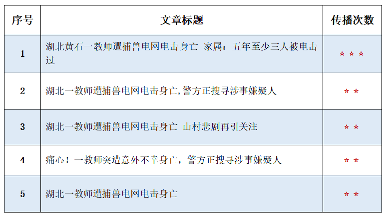 由上图可以看出,全网有关“湖北一教师遭捕兽电网电击身亡”的信息内容主要以中性为主,占44.2%,其次为负面,占34.2%,正面信息较少,占21.5%。