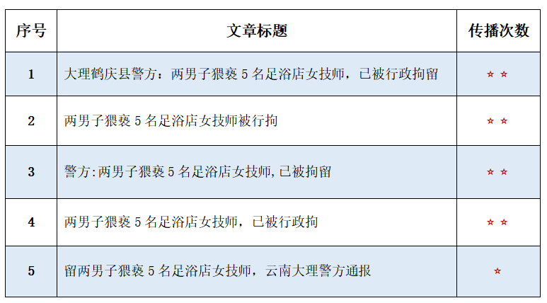 由上图可以看出,有关“两男子猥亵5名足浴店女技师被行拘”的舆情主要集中在“社交网络”平台,“社交网络”平台舆情,占总量的53.1%,其次为“新闻客户端”平台占31%以及“视频”占14.7%。