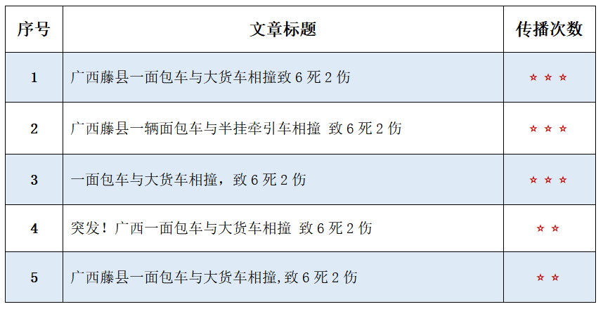 由上图可以看出,全网有关“广西藤县一面包车与大货车相撞致6死2伤”的信息内容主要以负面为主,占52.4%,其次为中性,占41.3%,正面信息较少,占6.4%。
