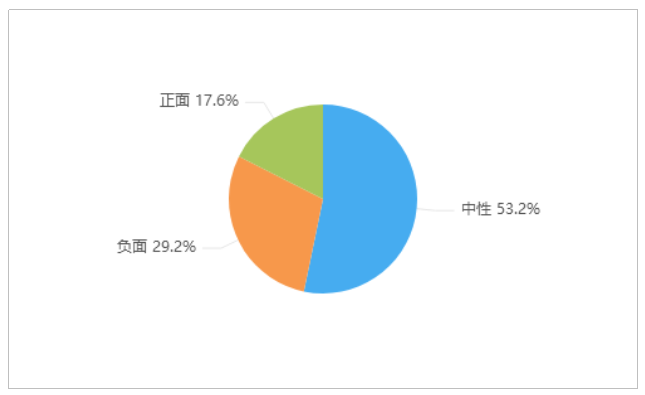 由上图可以看出,有关“四川网红唐飞机直播时坠机死亡”的舆情情感倾向,中性舆情占比最多,为53.2%;其次是负面舆情,占比29.2%;正面舆情占比最少,为17.6%。