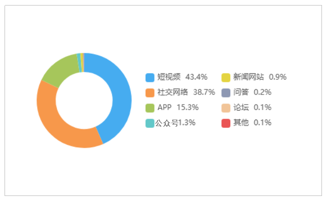 由上图可以看出,有关“四川网红唐飞机直播时坠机死亡”的舆情主要集中在短视频平台,相关舆情量,占总量的43.4%,其次为社交网络占38.7%,新闻APP占15.3%。