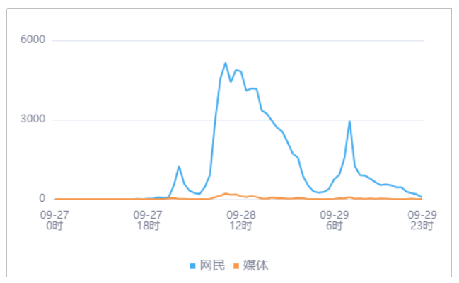 由上图趋势可以看出,有关“四川网红唐飞机直播时坠机死亡”的媒体舆情于09月28日09时达到最高峰,网民舆情于09月28日09时达到最高峰。