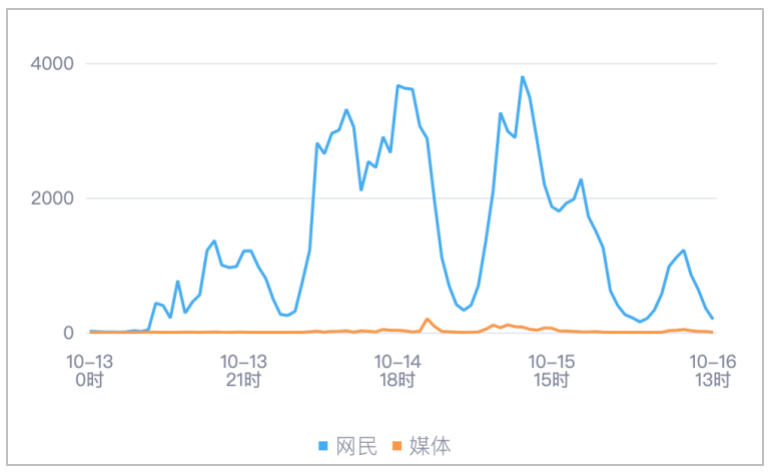 该时段内,境内有关“泰国一中国籍黑导游威胁游客”的舆情信息,媒体舆情于10月14日22时达到最高峰,网民舆情于10月15日11时达到最高峰。