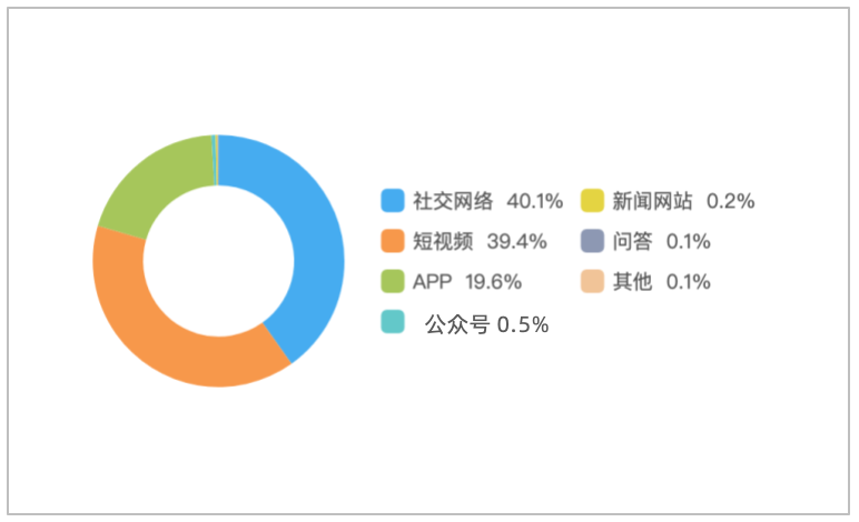 该时段内,境内有关“广州一动物血库灰色产业曝光”的舆情主要集中在社交网络平台,相关舆情量约占总量的40.1%,其次为短视频约占39.4%,新闻APP约占19.6%。