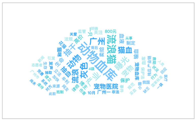 该时段内,有关“广州一动物血库灰色产业曝光”的话题提及频次较高的词语有“动物血库”、“流浪猫”、“灰色”、“动物”、“曝光”等。
