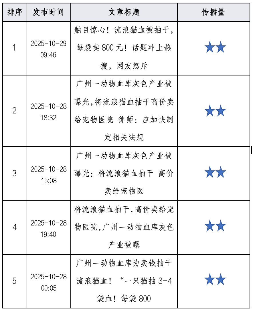 (一)关注动物血库灰色产业与“血猫”生存困境  据封面新闻、光明网、环球网报道,近日广州有博主曝光动物血库灰色产业,视频显示流浪猫被过量抽血后高价售卖给宠物医院,这类被称为“血猫”的动物生存状况堪忧。灰色产业链中存在抽血操作不规范、猫咪来源不明、缺乏健康筛查等问题,部分机构甚至通过圈养流浪猫长期供血牟利。相关视频引发公众对动物福利及医疗伦理的广泛讨论,律师指出我国目前缺乏针对宠物输血的行政法规,亟需制定行业规范与处罚措施。